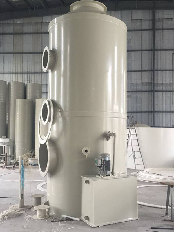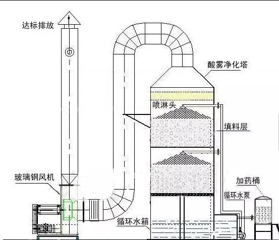 酸霧廢氣由風管引入凈化塔,經過填料層,廢氣與氫氧化鈉吸收液進行氣液兩相充分接觸吸收中和反應,酸霧廢氣經過凈化后,再經除霧板脫水除霧后由風機排入大氣。吸收液在塔底經水泵增壓后在塔頂噴淋而下,最后回流至塔底循環使用。凈化后的酸霧廢氣達到廣東省地方排放標準的排放要求,低于國家排放標準。